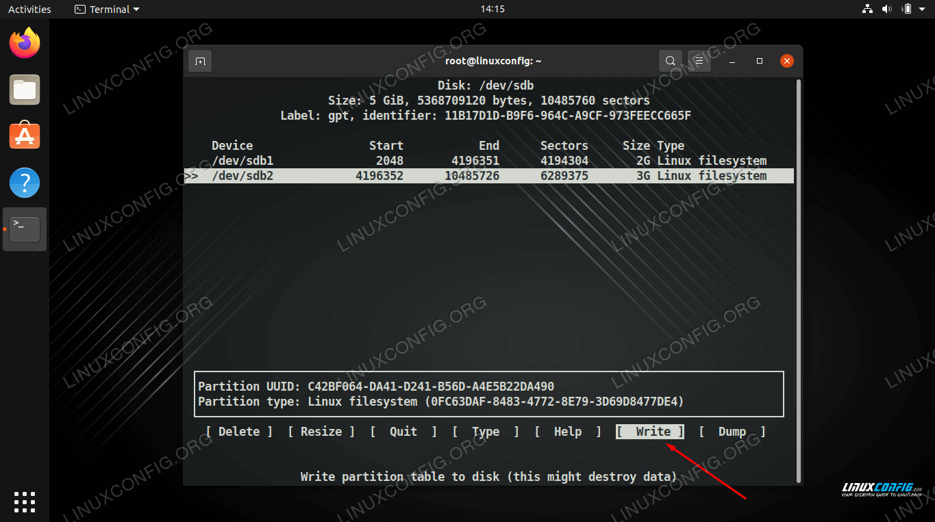 通过选择“写入”完成更改,然后在完成后退出实用程序。现在,当我们再次执行 fdisk -l 时,我们可以看到列出的分区。