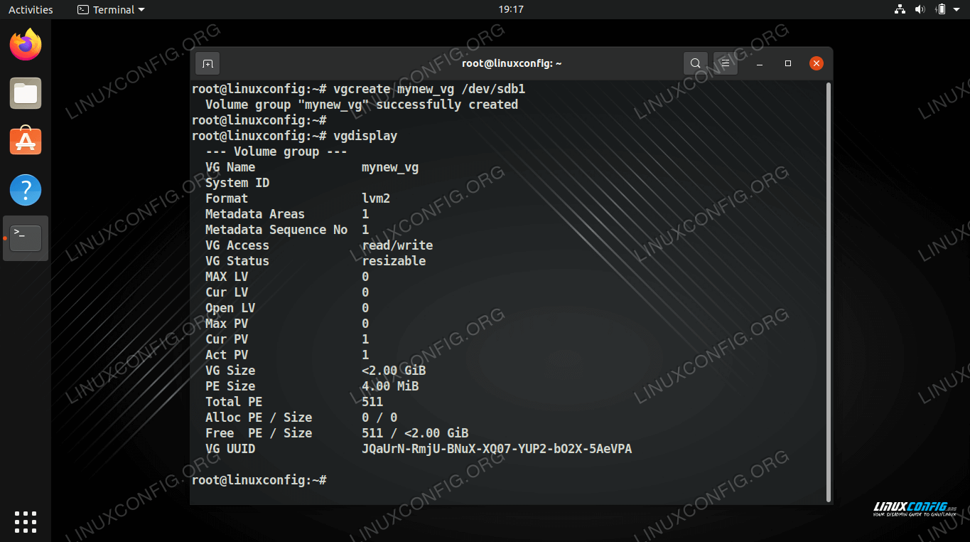 在此阶段,我们需要创建一个卷组,它将用作物理卷的容器。在此示例中,我们将使用以下 Linux 命令将卷组命名为“mynew_vg”,其中将包含 /dev/sdb1