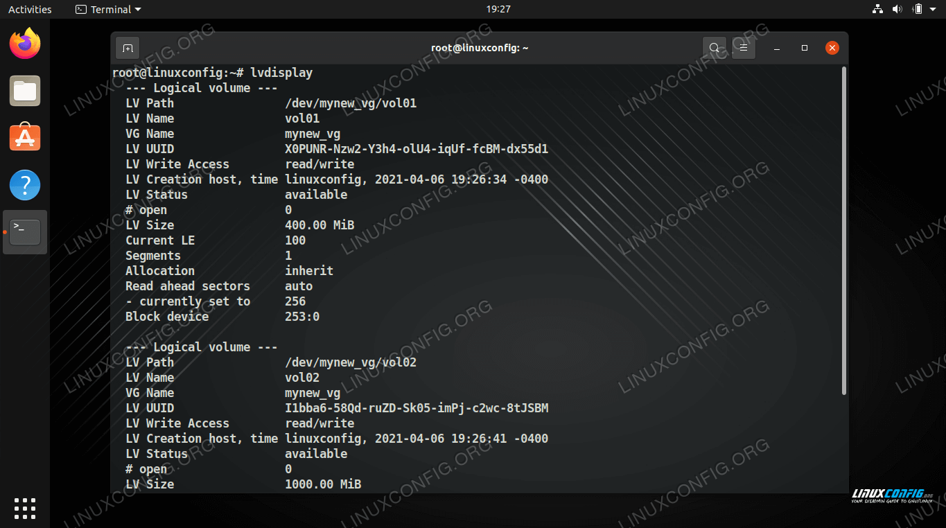 最后,我们可以使用 lvdisplay 命令来查看我们刚刚创建的逻辑卷。