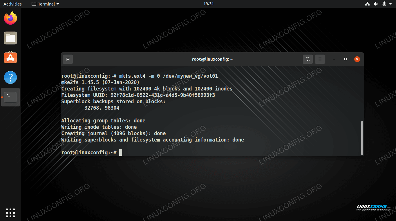 逻辑卷几乎可以使用了。我们需要做的就是使用 mkfs 命令在其上创建一个文件系统。