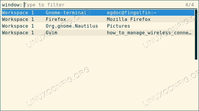 我们注意到的第一件事是,我们有一个输入字段,我们可以通过输入应用程序的名称来过滤应用程序。我们可以看到窗口中的输出分为三列:第一列显示窗口处于活动状态的工作区;第二列显示窗口处于活动状态的工作区;第二列显示窗口处于活动状态的工作区。第二个是应用程序本身的名称,第三个是应用程序的标题。一旦我们选择一行并按 Enter 键,焦点将切换到相关的应用程序窗口。
