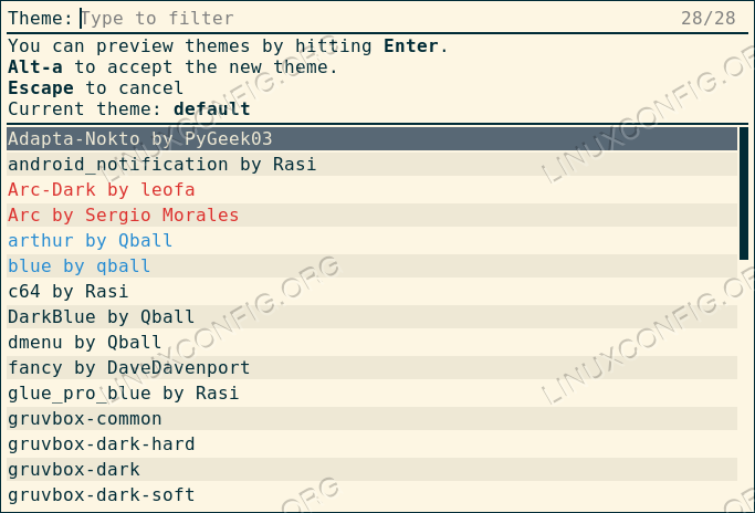 即使在这种情况下,我们也可以使用输入字段来过滤可用的主题。要确认我们想要使用选定的主题,我们可以按 Alt+e