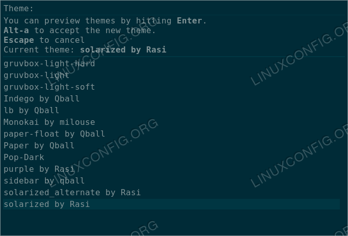 正如窗口本身所清楚描述的那样,我们可以通过选择列表中报告的主题之一并按 Enter 键来可视化预览该主题。这是一个“solarized”主题的示例: