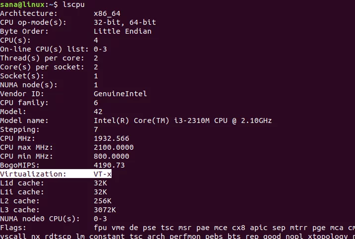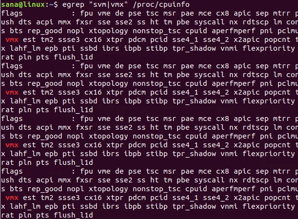 vmx 指示及其输出中的信息表明我的系统已启用并支持虚拟技术 Intel-VT。如果您没有找到此命令的任何输出,则表明 /proc/cpuinfo 不包含有关 VT 的任何信息,并且它不可用或已从 BIOS 设置中禁用。