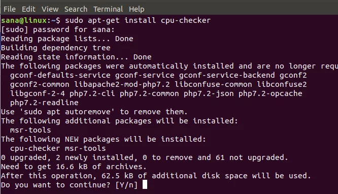 输入 sudo 密码后,系统可能会提示您使用 y/n 选项来验证是否要继续安装。请输入 y 并按 Enter 键,之后 cpu-checker 将安装在您的系统上