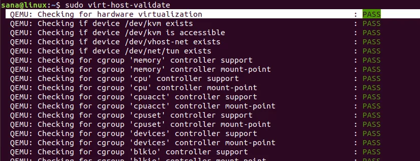 您可以看到“QEMU:检查硬件虚拟化”在我的系统上显示结果状态为“通过”。这表明我的处理器确实启用了 VT。如果任何人的输出结果状态为“FAIL”,则表明虚拟化要么不受支持,要么未启用。