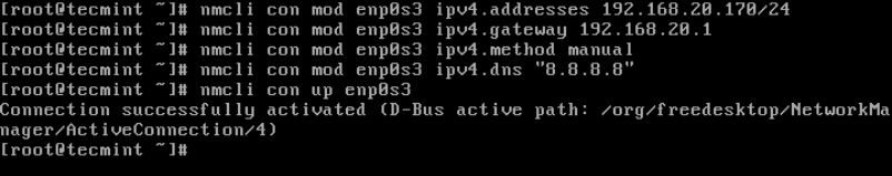 nmcli con mod enp0s3 ipv4.addresses 192.168.20.170/24