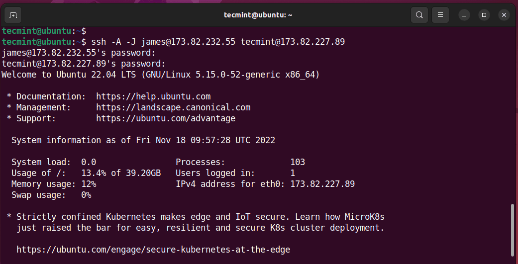 该命令将提示您输入跳转服务器的用户密码,然后是目标系统的密码,您将被授予访问目标系统的权限。