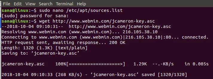 然后使用以下命令将 Webmin 存储库下载到系统上的源列表中: