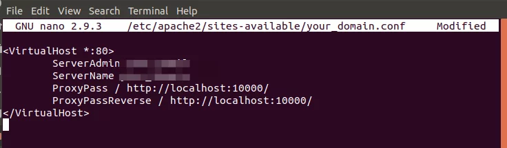 通过 CTRL+X 退出并保存文件,然后输入 Y 确认。该文件将告诉服务器将所有请求传递到端口 10000。