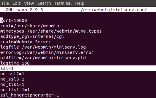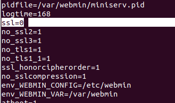 下一步是告诉 Webmin 停止使用 TLS/SSL,因为我们稍后将为此目的配置 Apache。运行以下命令以访问 miniserv.conf 文件: