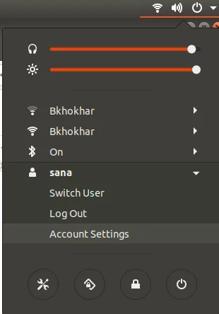 方法 1:单击位于 Ubuntu 屏幕右上角的向下箭头。然后单击您的用户名,然后单击“帐户设置”选项。