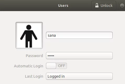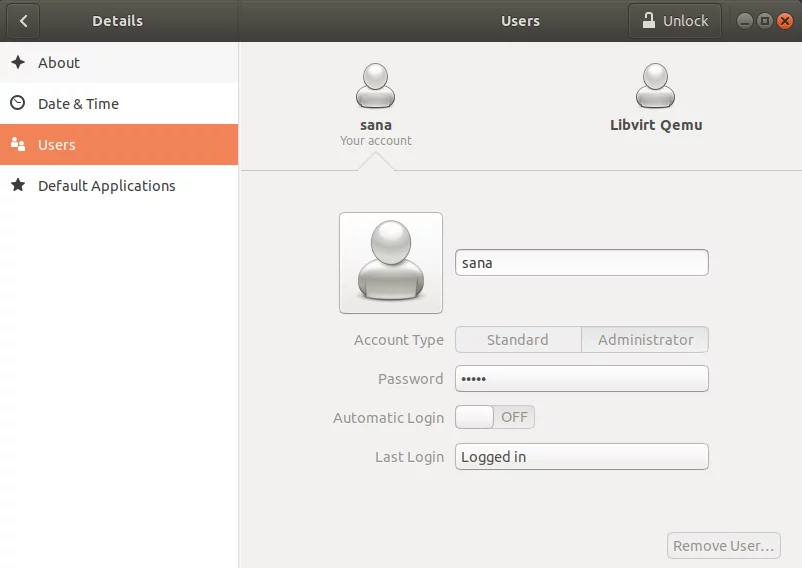 这将在 Ubuntu 设置实用程序的“详细信息”部分中打开“用户”选项卡,如下所示:
