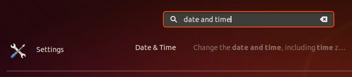 为了通过 UI 查看有关当前时区的信息,您需要访问“设置”实用程序中的“日期和时间”设置。您可以通过系统 Dash 执行此操作,如下所示: