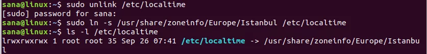 sudo ln -s /usr/share/zoneinfo/Europe/Istanbul /etc/localtime