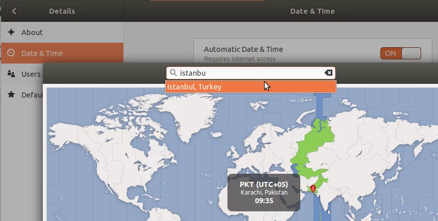 通过此视图,您可以通过搜索栏搜索时区,也可以通过鼠标手动移动到您的时区。一旦执行此操作,系统的时区就会更改。