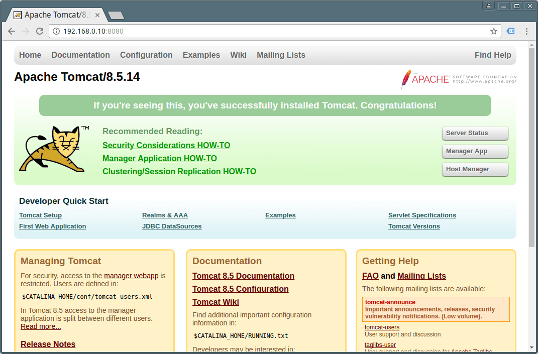 一旦“Tomcat Started”,您可以将浏览器指向http://127.0.0.1:8080,您应该看到如下内容: