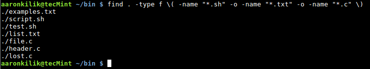 find . -type f \( -name "*.sh" -o -name "*.txt" -o -name "*.c" \)