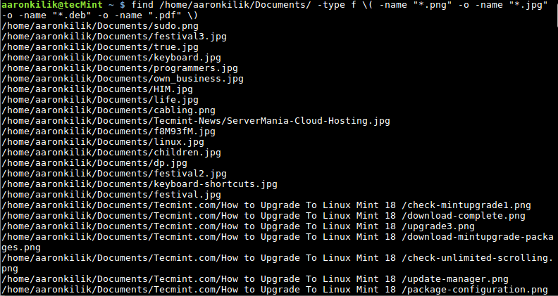 find /home/aaronkilik/Documents/ -type f \( -name "*.png" -o -name "*.jpg" -o -name "*.deb" -o -name ".pdf" \)