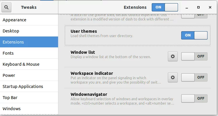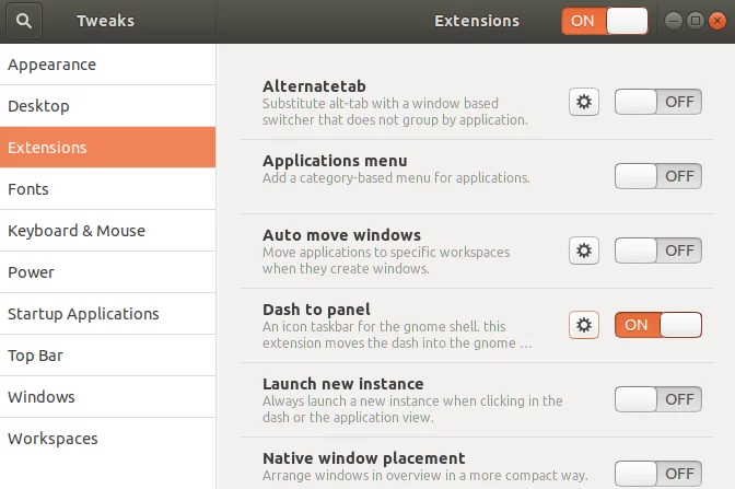 如果您希望在 Ubuntu 系统上集成相同类型的菜单,您可以通过 Tweaks 工具来实现。移至“扩展”面板,然后打开“应用程序”菜单按钮,如下所示: