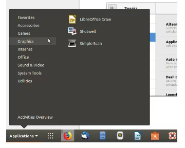 这是新应用程序菜单的样子。现在,您可以根据分配给每个应用程序的类别轻松启动应用程序。例如,所有图形应用程序(例如 LibreOffice Draw、Shotwell 和 Simple Scan)都在我的系统上分类在“图形”下。