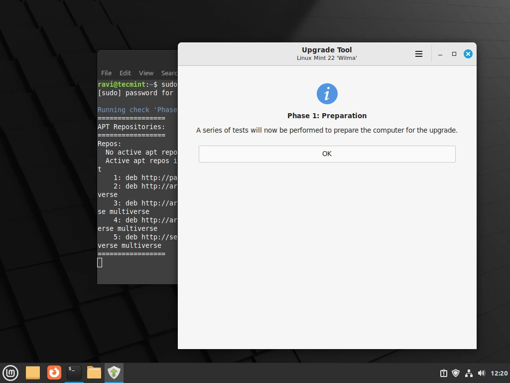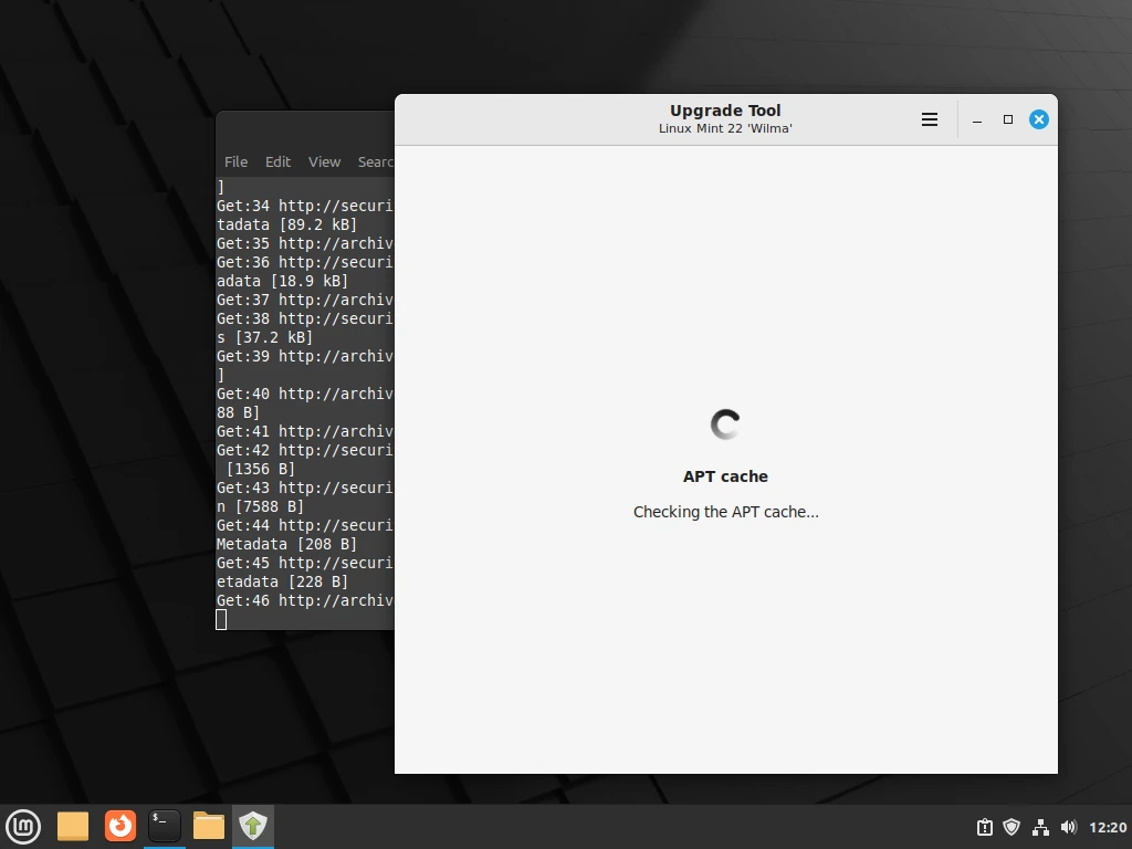 首先,打开终端,运行以下命令刷新 apt-cache,并安装 mintupgrade 升级工具: