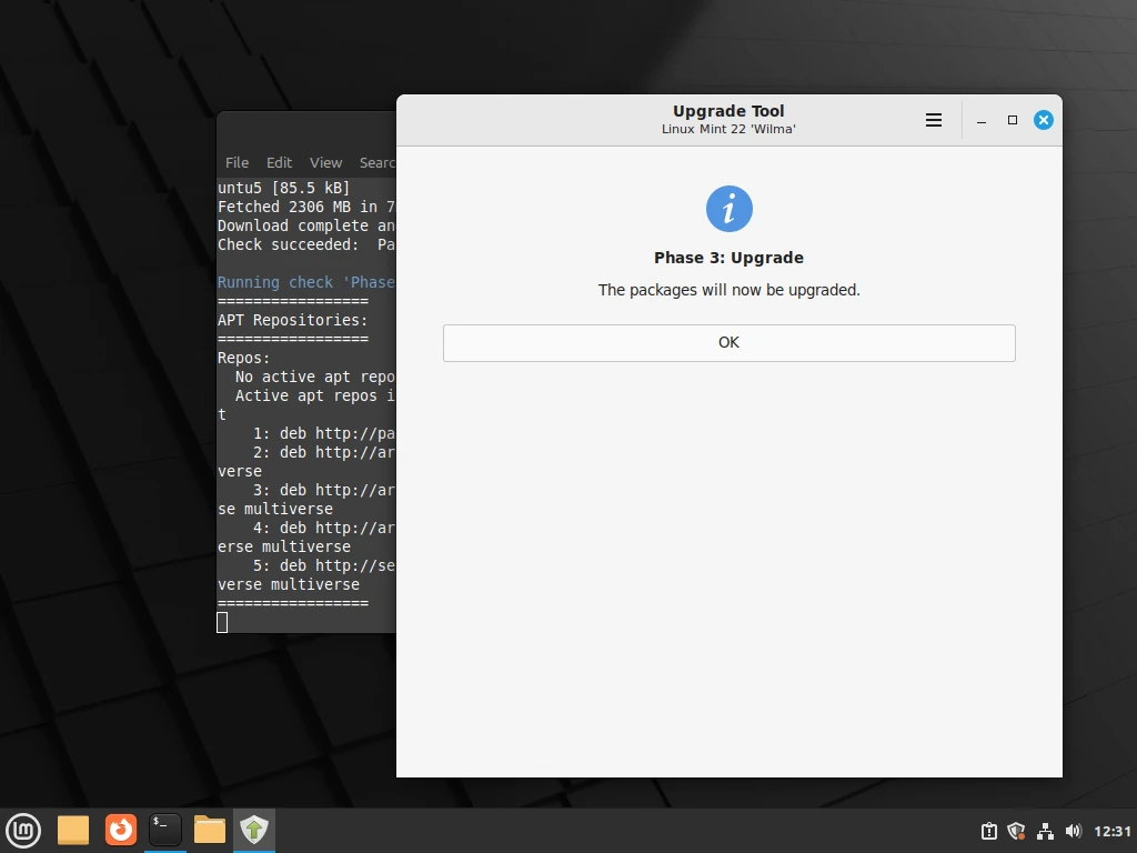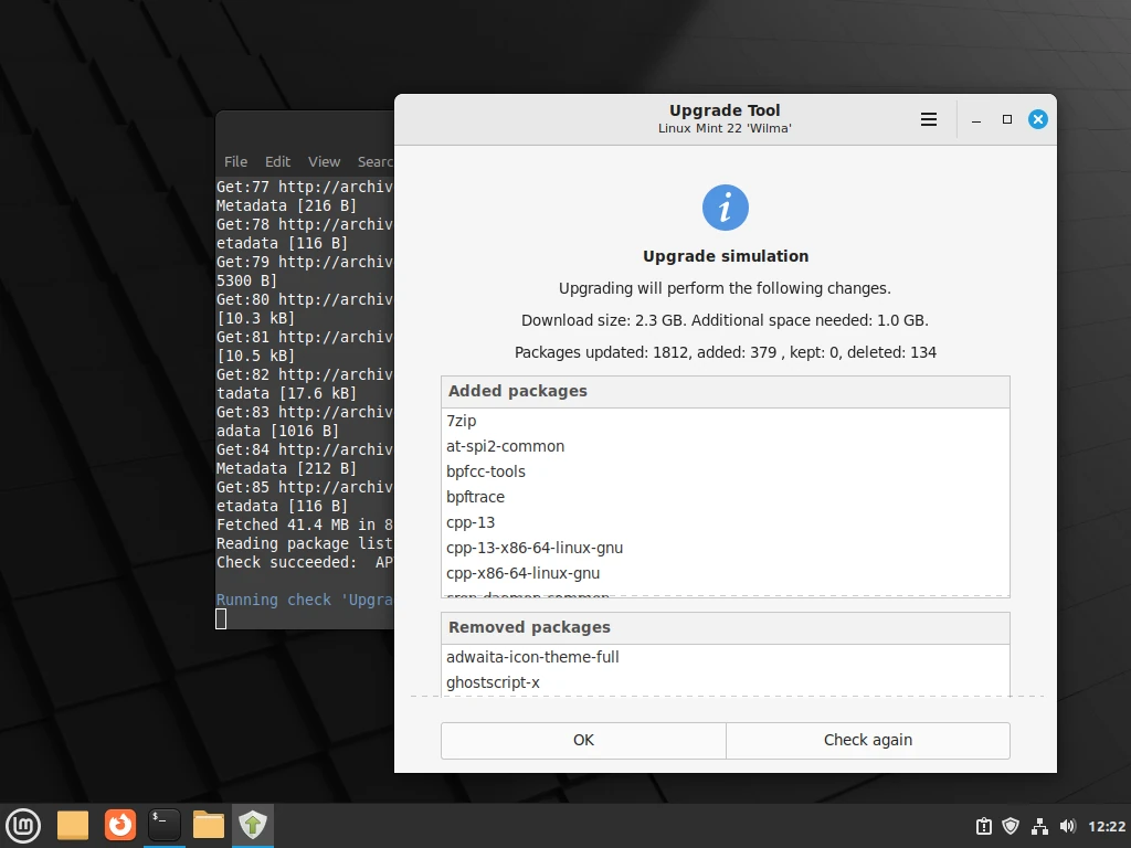 如果所有测试都正常,升级工具将在后台运行apt更新,从配置的软件存储库中获取最新版本的软件包列表,您可以从终端查看详细信息。