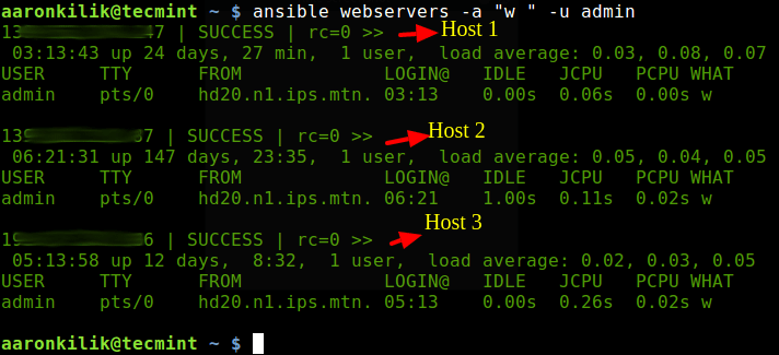 现在要检查正常运行时间以及连接到webserver组中指定的所有服务器的用户,在上面的主机配置文件中,只需运行ansible命令行工具,如下所示。