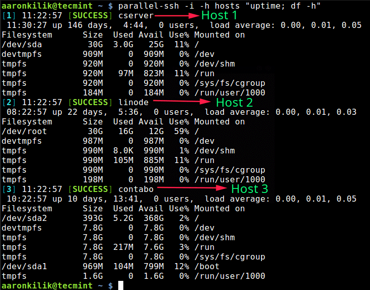 pdsh -w ^hosts -R ssh "uptime; df -h"