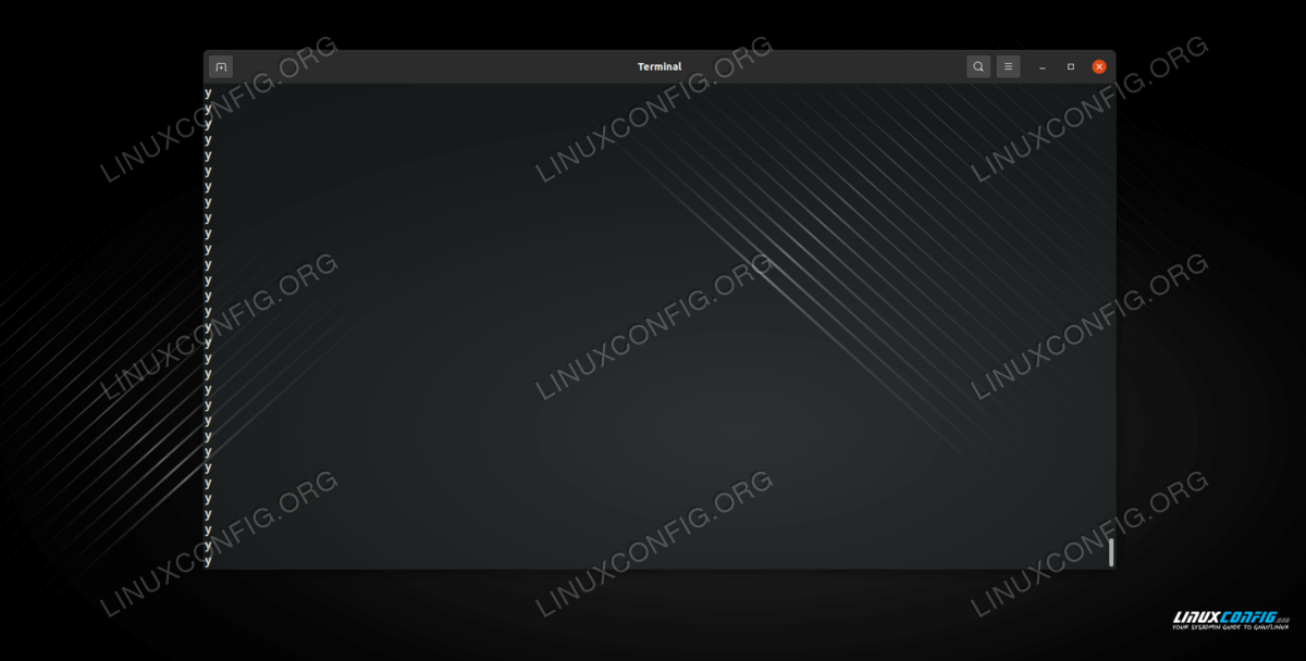 yes 命令将重复输出“y”或我们指定的其他字符串。看一下下面的一些示例,了解 Linux 中的 yes 命令实际上是如何工作的。