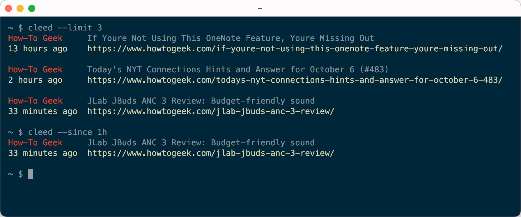 该应用程序显示每个故事的标题、发布日期和时间以及 URL。如果您的终端支持 URL,您可以单击每个 URL 将其打开并阅读相应的故事。