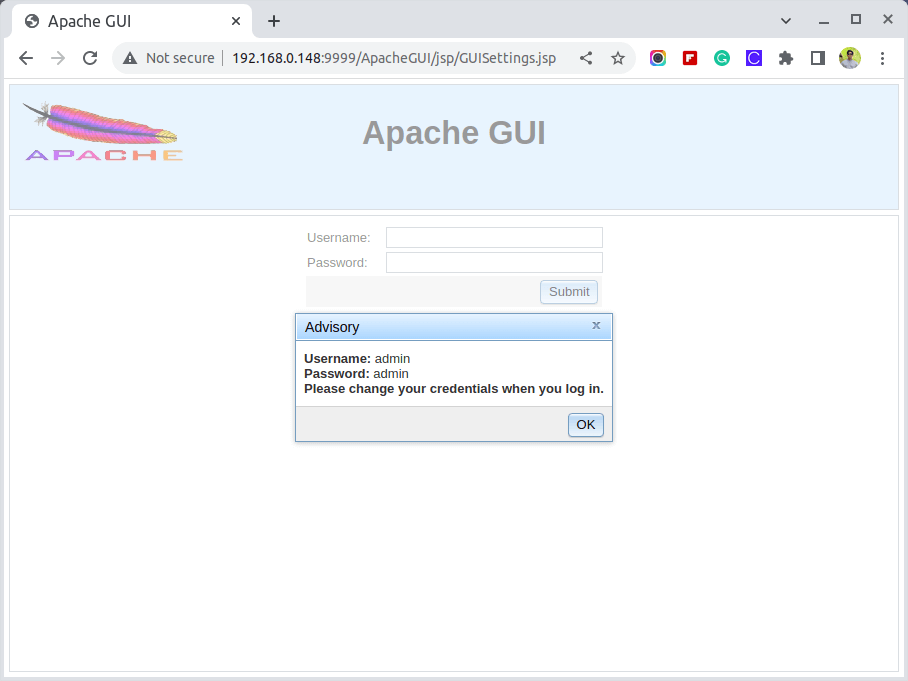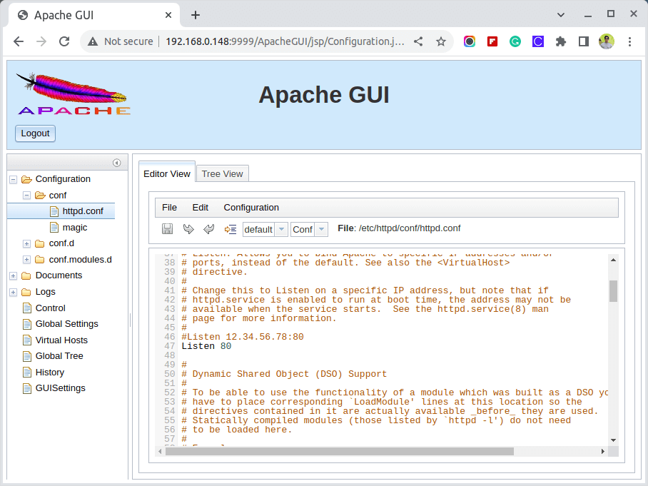 要从浏览器获得对 Apache GUI Web Tool 的远程控制,您需要在系统防火墙上添加一条打开端口 9999/TCP 的规则,这是默认端口Apache GUI 工具监听。
