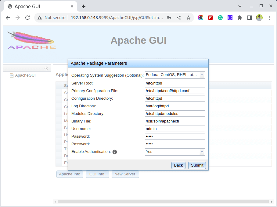 9. 为您的 Apache Web 服务器包参数提供以下配置,并选择用户名和强密码以便下次登录 Apache GUI。