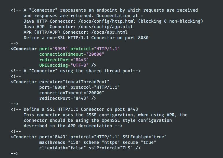 6. 如果 Apache GUI 使用的端口 9999 与系统上的另一个应用程序重叠,您可以通过编辑 ApacheGUI server.xml 配置文件来更改它,搜索 Connector port= ”9999 ” protocol= ”HTTP/1.1 ” 指令,并将端口语句替换为您喜欢的端口号(不要忘记同时应用端口防火墙规则)。