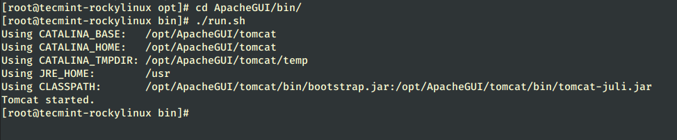 4. 现在,是时候启动并验证 Apache GUI Web 工具功能了。将目录更改为 ApacheGUI/bin/ 路径,并使用 run.sh 脚本启动该工具,并使用 stop.sh 脚本停止服务器。