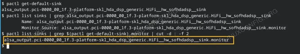 使用此命令查找系统的默认音频接收器(输出设备)。接下来确定来源: