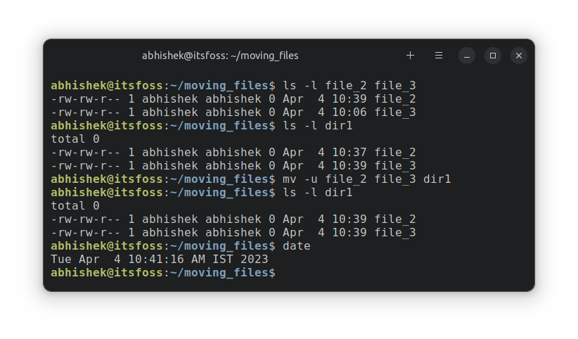 abhishek@linux:~/moving_files$ mv -u file_2 file_3 dir1