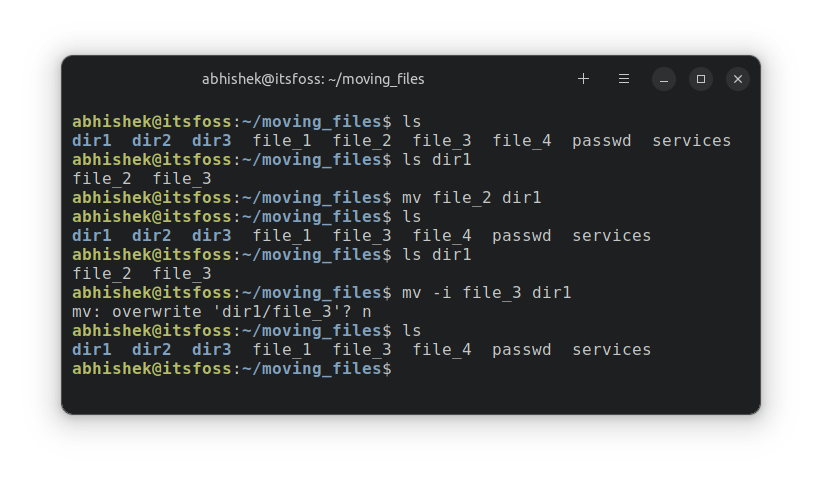 abhishek@linux:~/moving_files$ mv -i file_3 dir1