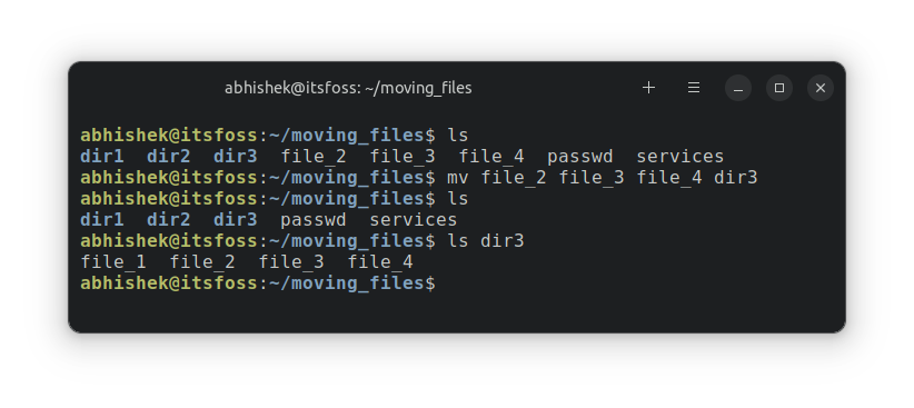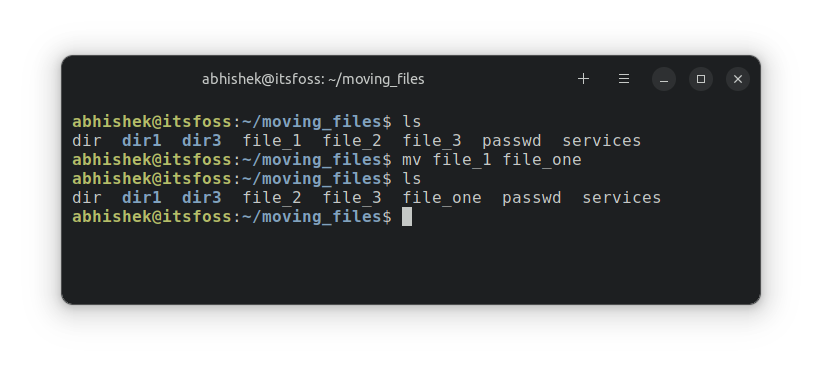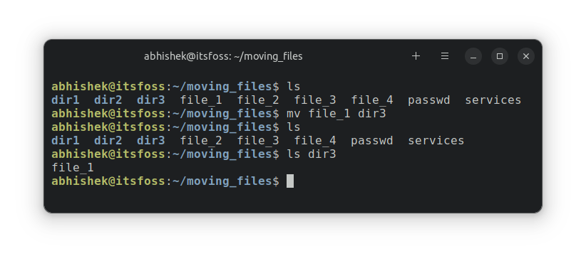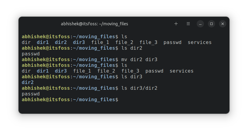 abhishek@linux:~/moving_files$ mv services dir3/my_services