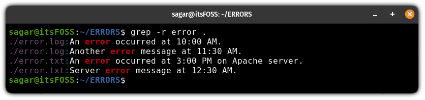 如果您想从目录中存在的每个文件中搜索特定模式,则可以递归地使用 grep 命令,它将从该特定目录中存在的每个文件中搜索给定模式。