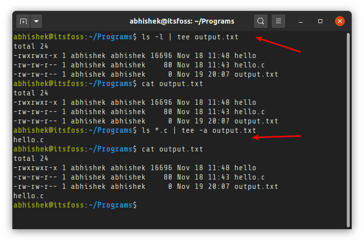 您还可以通过以下方式在附加模式下使用 tee 命令和选项 -a: