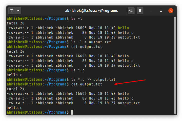 为此,您可以在 Linux 中使用重定向。使用重定向运算符,它不会在屏幕上显示输出,而是转到提供的文件。