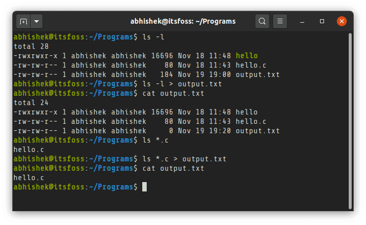 下面的例子更好地说明了这一点。它首先保存 ls -l 命令的输出。然后,它用 ls *.c 命令的输出替换文件的内容。