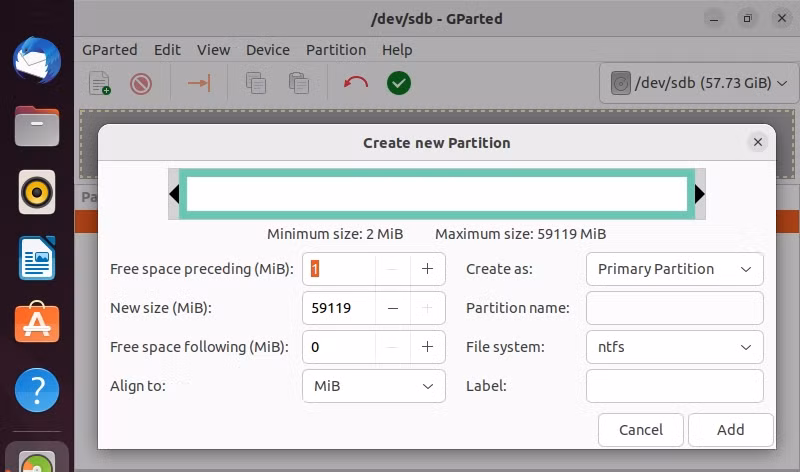 将出现新分区的配置窗口。您不需要调整大多数默认值,但如果您有特定的配置,则可以这样做。单击文件系统旁边的下拉菜单,然后从列表中选择NTFS。最后,单击添加并确认您要格式化该分区。