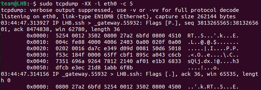 sudo tcpdump -XX -i eth0