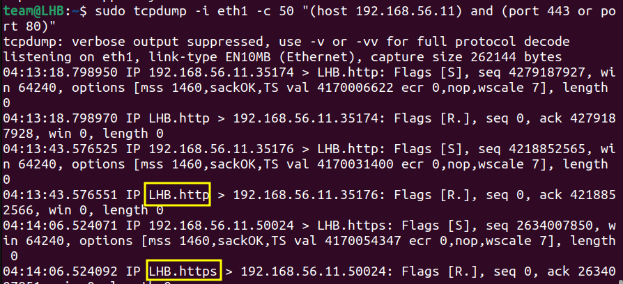 sudo tcpdump -i eth1 -c 50 “(host 192.168.56.11) and (port 443 or port 80)"