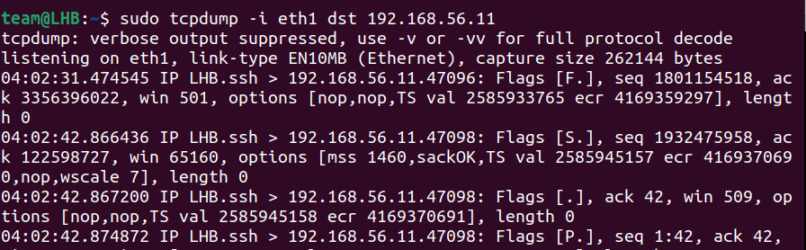 sudo tcpdump -i eth0 host 192.168.56.10