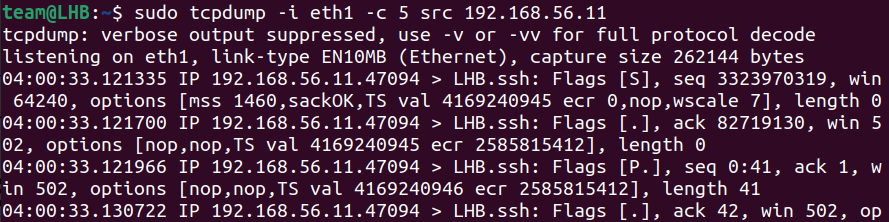 sudo tcpdump -i eth1 -c 5 src 192.168.56.11