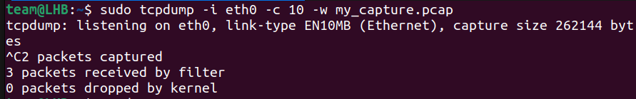 sudo tcpdump -i eth0 -c 10 -w my_capture.pcap