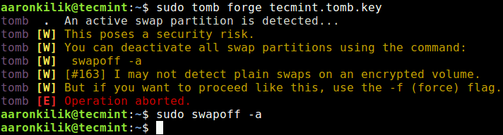 在创建密钥时,如果磁盘上存在交换空间,tomb 将会发出警告,如果交换内存打开,它将终止,如下面的屏幕截图所示。这是由于与磁盘上的交换内存相关的安全风险(请参阅文档或手册页以获取更多信息)。